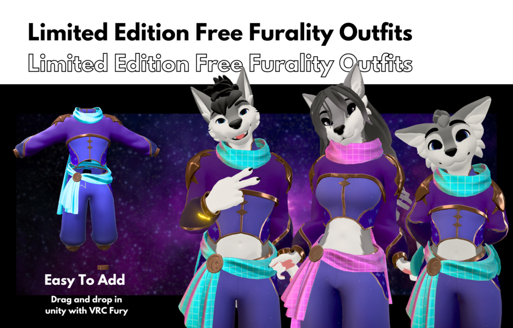 These clothes work for all three of the canine avatars and are set up to work with the Furality shader, including emissives for Luma Glow/Audio Link! They are quick and easy to add using VRCFury :)