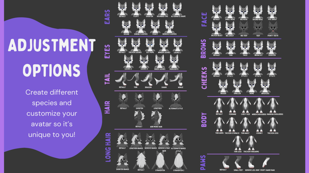This avatar includes many of the same options as the other canine avatars so you can shrink down and become a smol chibi pupper <3