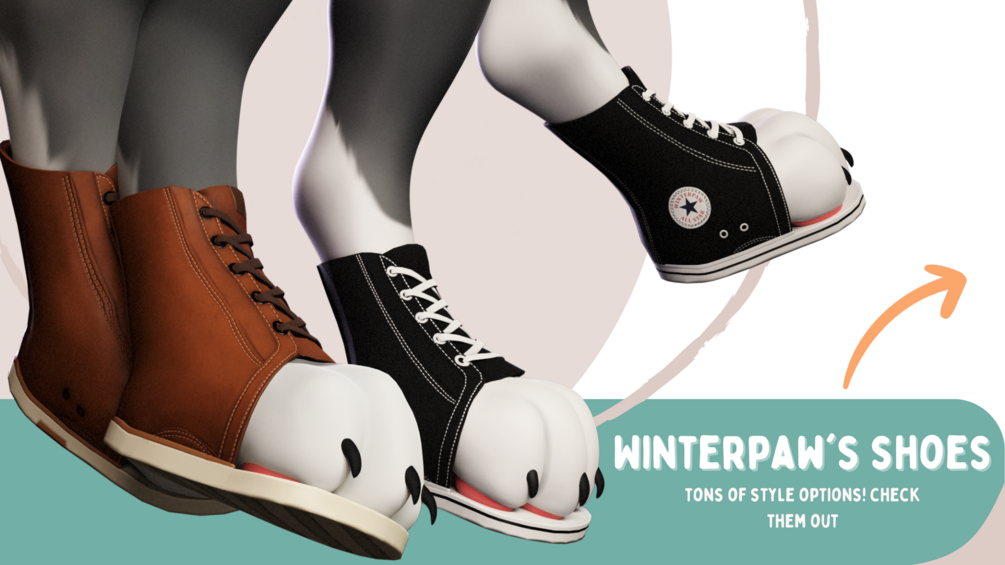 These shoes are rigged and set-up to be added to the Fem Canine, Canine,or Feline avatars! It requires zero Blender knowledge and comes with an in-game menu, customization, tutorials and editor files.